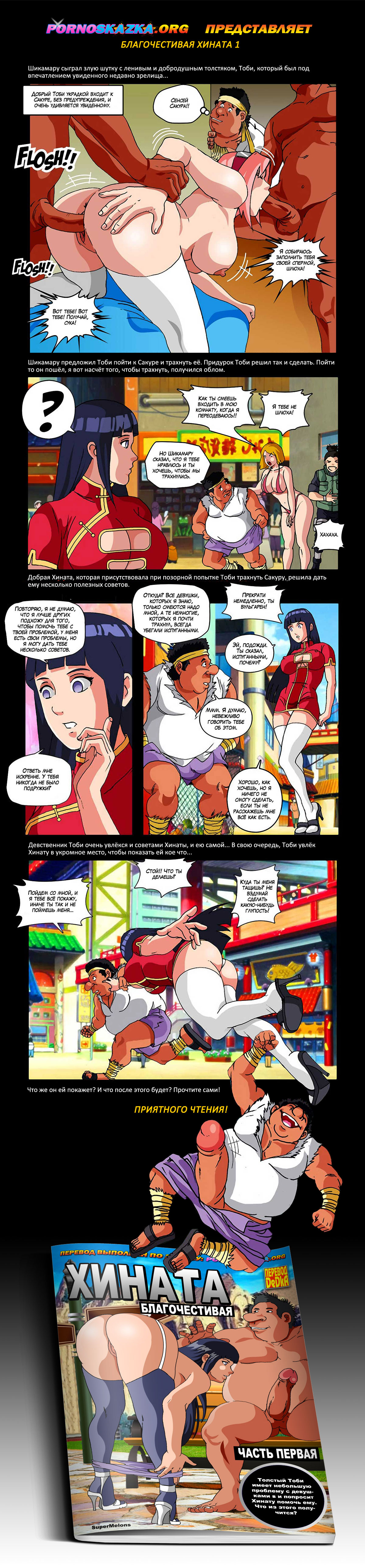 Порно комикс «Благочестивая Хината» расскажет вам о том, как Шикамару сыграл с ленивым и добродушным толстяком, Тоби, злую шутку. Он предложил Тоби пойти к Сакуре и трахнуть её. Придурок Тоби решил так и сделать. Пойти то он пошёл, я вот насчёт того, чтобы трахнуть, получился облом. Добрая Хината, которая присутствовала при позорной попытке Тоби трахнуть Сакуру, решила дать ему несколько полезных советов. Тоби очень заинтересовался и советами Хинаты, и ею самой…